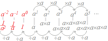 (1)(2)←解説a≠0, nを正の整数とするとき a−n= …(1) a0=1 …(2) 指数が1ずつ増加するとき,式の値は底aの値だけ掛けたものになります. ![]() このようにして a0=a1÷a=1, a−1=a0÷a=, a−2=a−1÷a=, a−3=a−2÷a=, … a−n=, (1)←別の解説 m<nのとき,次の式には負の指数が登場します.