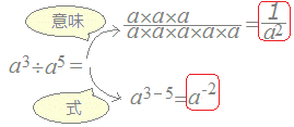負の指数のまま計算すると a−2a5=a−2+5=a3 定義に従って負の指数を分数に戻すと a−2a5=a5=a3 これらは等しいから,青で示したように単に指数の足し算をすればよい. (3)→例