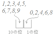 2桁の正の整数のうちで、十の位の数が奇数で、一の位の数が偶数となる数は何通りありますか。 (解答)十の位の数の決め方は、1,3,5,7,9の5通り その各々について、一の位の数の決め方が、0,2,4,6,8の5通りあるから
