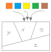 赤、青、黄、緑、茶色の5色のうち異なる4色を使って、次の図のア〜エを塗る方法は何通りありますか。
