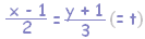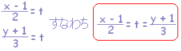 ■ 媒介変数の消去とは -- 媒介変数表示をx,yの関係式に直すには,媒介変数を消去します。それはなぜ? 例 次の媒介変数表示において,tがすべての実数を変化するとき,点x,yの通るグラフの方程式をx,yの関係式で表わすことを考えると: x = 2t + 1・・・(1)(1)(2)は,次の式と同じ ※ 上の□枠内において,共通の t が2つの表現で結ばれているのが第1のポイントです。 ※ 次にt が舞台から消えるのが第2のポイントです。 すなわち,x,yの関係式は 3(x - 1) = 2(y + 1) |