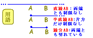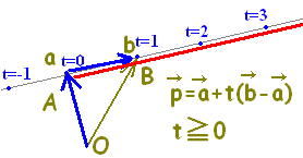 ![]() 位置ベクトルの表す点Pは, には,直線AB全体が対応します。・・・(1) ![]() には,半直線ABが対応します。・・・(2) ![]() には,線分ABが対応します。・・・(3) ![]() |