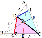 • この図の場合,交点の内の1つは三角形の外に来る. • 「分子」→『分母』の見方として,「頂点.交点」→『交点.頂点』の順に正確に見ていく必要がある. • 直線上の交点間の比は求められない.求めたいものは三角形の辺の内分比または外分比として設定することが重要 よって,CP:PD=7:2…(答) |