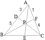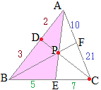 【問題3】右図の△ABCにおいて,ABを2:3に内分する点をD,BCを5:7に内分する点をEとし,CDとAEの交点をPとする.さらに,BPの延長がCAと交わる点をFとする. このとき,CF:FA, AP:PE, BP:PF, CP:PDをそれぞれ最も簡単な整数比で表してください. |