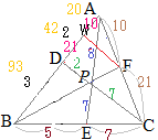 ここでCF,FVの縮尺を変えて,CF:FV=7:2=21:6にしておくと,CF:FV:VA=21:6:4FV:VA=BD:DA=3:2だからCF:FAも求まるのだ! よって,CF:FA=21:10…(答)