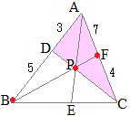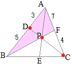 【問題4】右図の△ABCにおいて,ABを3:5に内分する点をD,CAを4:7に内分する点をFとし,BFとCDの交点をPとする.さらに,APの延長がBCと交わる点をEとする. このとき,BE:EC, AP:PE, BP:PF, CP:PDをそれぞれ最も簡単な整数比で表してください. |