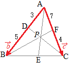だからはBCをm:nに内分する点Eです.このように分子の係数の和と分母が一致していれば,それは内分点であることを表しています. しかし,それらが一致していなければ のように変形すると(7で割って7を掛ける) 「内分比も縮尺比も分かる」「一石二鳥」なのです. 内分点までのベクトルを縮小したものが まず,分子の係数の和を分母にして,内分公式に合う式にして,その後で分数を調整するのがコツ BE:EC=4:3 AP:PE=7:6 BP:PF=10:3 CP:PD=9:4 |