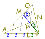 | (参考) 中学校の数学で相似図形の性質を用いると 右図によりAP:PN=4:1 ・・(a)右図によりBP:PM=3:2 ・・(b)(b)より右図AL:LB=2:1 ![]() b)より右図OP:PM=3:2 ![]() |