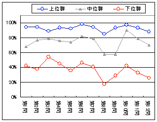 グラフ4は,合計得点によって回答者を上位群,下位群(各27%),中位群(残り)に分けたときの問題別正答率で,どの問題においても上位群と下位群の差は35%以上ある.中位群・下位群が大きく崩れるのは第9問,10問の整数問題である.