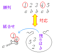 例えば abbab では a の番号を1番と4番の2つに決めれば残り2,3,5番は b になる.したがって,aabbb の並べ替え方は,異なる5個の番号札から a の行き先の番号札2個をもらう方法の数 5C2 に等しく,組合せの公式