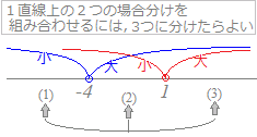 ◇(要点)◇ ○ |a| は絶対値記号の中身a の正負によって外れ方が変る.そこで,絶対値記号の中身=0 となる値を境目として,場合分けする. a<0 のとき,|a|=−a 0≦a のとき,|a|=a ○ |x−1| は,次のようにx の値で場合分けすれば,絶対値記号を外すことができる. (1) x<1 のとき,|x−1| =−x+1 (2) x≧1 のとき,|x−1| = x−1 ○ 2つの絶対値記号を外すには,3つの区間に場合分けする. |x+4|+|x−1| は,次のように場合分けすれば,絶対値記号を外すことができる. ![]() (2) −4≦x<1 のとき,|x+4|+|x−1|= x+4−x+1=5 (3) 1≦x のとき,|x+4|+|x−1|= x+4+x−1=2x+3 |