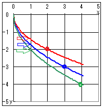 • このグラフは, x が大きくなるにしたがって傾きが緩やかになるが,傾きが0(真横向き)になることはない.
