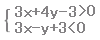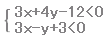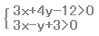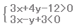 ○y=mx+kの直線の上側はy>mx+kで表わされ,下側はy<mx+kで表わされます。共通部分は連立方程式で表わします。 左の問題では,y=-3/4x+3の上側でy>-3/4x+3 → 4y>-3x+12 → 3x+4y-12>0 y=3x+3の下側でy<3x+3 → 3x-y+3>0 となります。 |