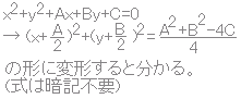 ○円の方程式の標準形 円(x-a)2+(y-b)2=r2 (r>0)の中心は(a,b),半径はr ○円の方程式の一般形 円x2+y2+Ax+By+C=0の中心と半径 ![]() 左の問題では,(x-3)2+(y+4)2=1と変形すると 中心(3,-4),半径1となります。 |