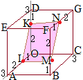 とし,OD2:1に内分する点をKOA1:2に内分する点をLとする。BF上の点MFG上の点NおよびK, Lの4点は同一平面上にあり,四角形KLMNは平行四辺形であるとする。
