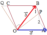 1辺の長さが1のひし形OABCにおいて,AOC=120°とする。辺AB2:1に内分する点をPとし,直線BC上に点Qとなるようにとる。以下,とおく。