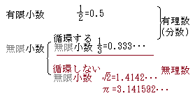 右図に示すように,有理数(整数÷整数の分数)であるか無理数であるかの区別は,有限小数になるか無限小数になるかの区別には関係ありません.