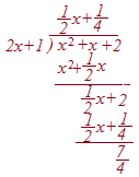 多項式の割り算では,余りが割る式と同じ次数ではまだ計算の途中とみなす.余りは必ず割る式よりも次数が低くなっていなければならない.だから,次の割り算のように「係数が分数になっても」余りの次数を下げなければならない. 右の例では,整数係数の多項式を整数係数の多項式で割ったときに,商も余りも有理数(分数)の係数になっている.