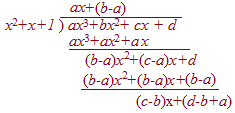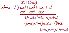 右図のように割り算を実行すれば,余りは(b−a)x+(c−a) したがって b−a=−1…(2) c−a=−2…(3) (1)(2)(3)より a=1, b=0,c=−1 余りはx2−1…(答) |