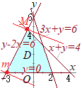 (1) 右図の水色で示した部分(内部および周上) (2) x+2y=kとおくと, また,mで示した点(−3, 0)で最小値−3をとる. (3)