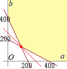 すなわちa+2b≧400 0≦a, b 脂質がc(g)になるとすると c=0.03a+0.03b 右図の赤丸で示した点の座標は 最小値8(g)・・・(答) |
