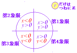 | ○三角関数の符号 上図のように各象限ごとに x , y の符号が決まっているので,三角関数の符号が定まる. ![]()
