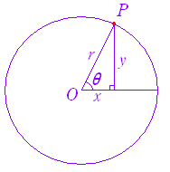 原点を中心とする半径 r の円周上を点Pが動くとき,動径OPがx軸の正の向きとなす角をθとする. このとき,点Pの座標を ( x, y ) ,円の半径を r として,三角関数を ![]() ![]() |