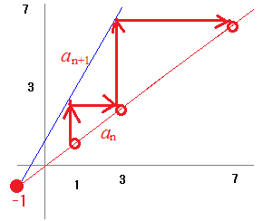 このという解は,何らかの事情で(たまたまa1=−1だった場合など)anの値に,はまり込んでしまったら,an+1以降の値も次々にその値にはまり込んでしまって抜け出せなくなる値(不動点:ブラックホールのようなもの)<特性方程式の解が不動点>を表しています.