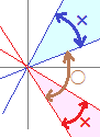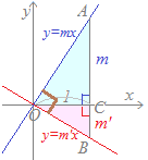 したがって,2直線y=mx…(1') とy=m'x…(2')が垂直になることができるのは,m, m'の一方が正の値(右上がりの直線)で他方が負の値(右下がりの直線)になっている場合です.