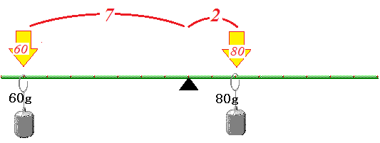 だから,左に回す力が大きくなって,「左が下がる」ことになります.右に回す力:80×2=160 ※左右に回す力が等しくなるときは,「つり合います」 |