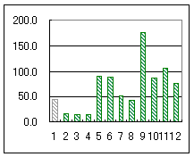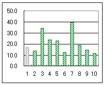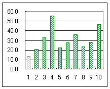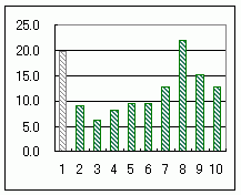 グラフ2は横軸が問題番号,縦軸は直前の操作以降その問題の採点までの所要時間(秒)を表わす.ただし,第1問は初めからの時間.