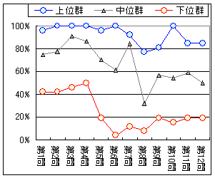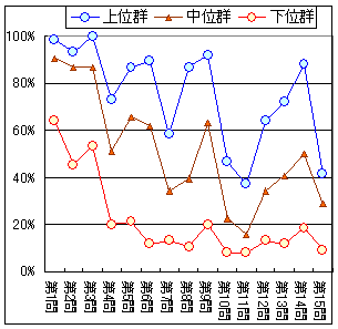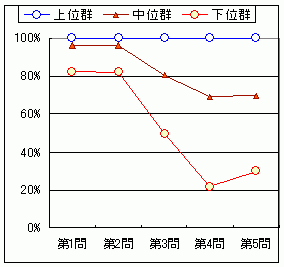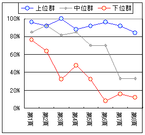 グラフ5は回答者全体をその合計得点によって上位群,中位群,下位群の3群に等分したときの群別・問題別正答率のグラフで,第1問を除けばどの問題も識別力が非常に高い.