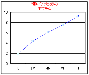 グラフ4は回答者全体をその合計得点によって高(H)〜低(L)の5群に等分したときの群別平均得点のグラフで,どの層においても識別力が高いことが分かる.