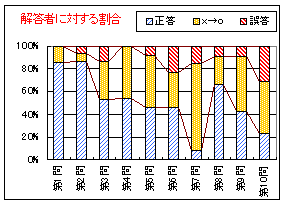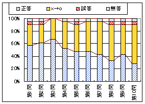 左のグラフ1は問題ごとの正答,誤答,無答の割合(正誤は最初の採点)で,黄色で示したものは初め誤答で再試行の結果正答に変った割合を表わす.