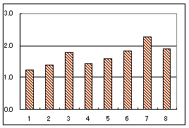 グラフ4は回答者全体をその合計得点によって上位群,中位群,下位群(各3分の1)に分けたときの群別・問題別正答率のグラフである.これによればどの問題でも各群は分離されている.(U-L指数は0.45〜0.7)