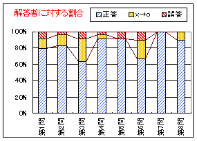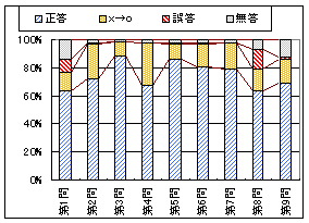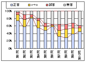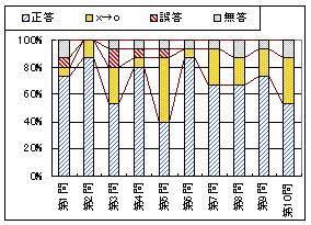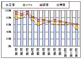 左のグラフ1は問題ごとの正答,誤答,無答の割合(正誤は最初の採点)で,黄色で示したものは初め誤答で再試行の結果正答に変った割合を表わす.