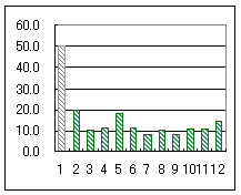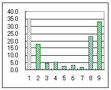 グラフ2は横軸が問題番号,縦軸は直前の操作以降その問題の採点までの所要時間(秒)を表わす.ただし,第1問は初めからの時間.
