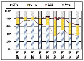 左のグラフ1は問題ごとの正答,誤答,無答の割合(正誤は最初の採点)で,黄色で示したものは初め誤答で再試行の結果正答に変った割合を表わす.この頁については無答答案が多いので,各問題の解答者に対する割合も下に示す.