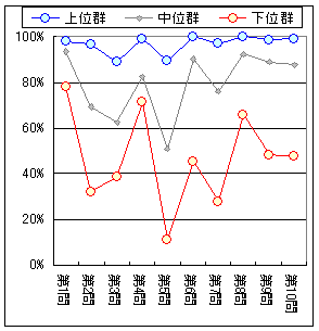 グラフ5は合計得点によって回答者全体を上位群,中位群,下位群(各33%)に分けたときの群別・問題別正答率を示す.