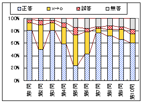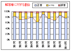この頁の学習により,正答率は76.0%から94.4%へ変化し,ここで扱った項目に関して18.4%の成績アップが見込まれる.(ラジオボタン方式による3〜5択なので,やり直せば当たるという事情は割り引いて考えるべし〜♪)
