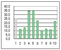 グラフ2は横軸が問題番号,縦軸は直前の操作以降その問題の採点までの経過時間(秒)を表わす.ただし,第1問は初めからの時間.