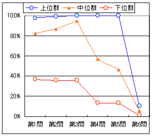 グラフ5は回答者全体をその合計得点によって上位群,中位群,下位群の3つの群に等分したときの群別・問題別正答率で,全員正答となっている第1問,第6問を除けば識別力はよい.