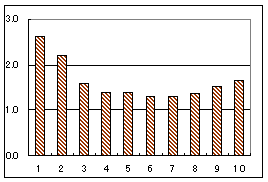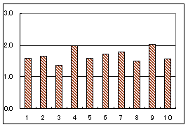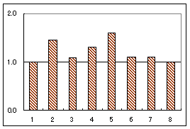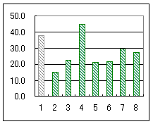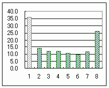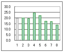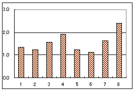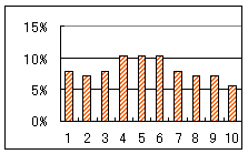 グラフ5は回答者全体を上位群,中位群,下位群の3群に等分したときの群別・問題別正答率のグラフである.これによれば,どの問題でもUL指数(上位群と下位群の正答率の差)は0.3〜0.96と高く,学力差は識別できる.特に第4問では下位群の崩れが目立ち,第8問ではすべての群で崩れていることが分かる.