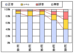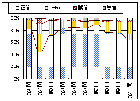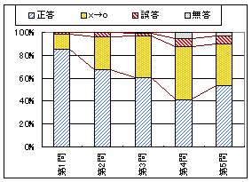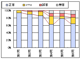 左のグラフ1は問題ごとの正答,誤答,無答の割合(正誤は最初の採点)で,黄色で示したものは初め誤答で再試行の結果正答に変った割合を表わす.