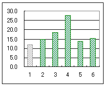 グラフ5は回答者全体を上位群,中位群,下位群に3等分したときの群別・問題別正答率である.これによれば,第6問を除けばどの問題もUL指数(上位群の正答率-下位群の正答率)は0.6以上と非常に高く,学力差は識別される.ただし,第6問は全体に正答率が低過ぎて識別できない.
