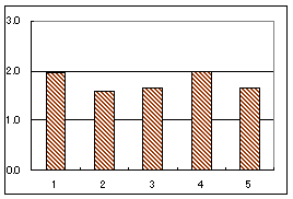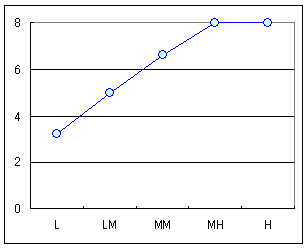 グラフ4は回答者全体をその合計得点によって高(H)〜低(L)の5群に等分したときの群ごとの平均得点のグラフである.これによれば,問題がやさしいため高得点者の識別精度はよくないことが分かる.