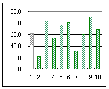 グラフ2は横軸が問題番号,縦軸は直前の操作以降その問題の採点までの経過時間(秒)を表わす.ただし,第1問は初めからの時間.
