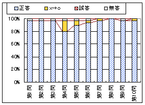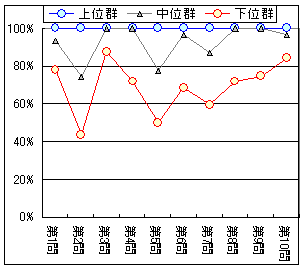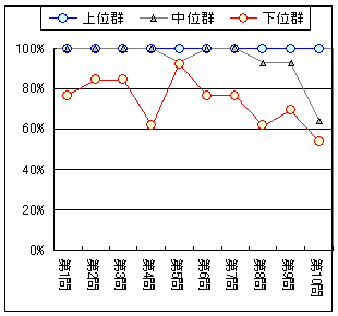 グラフ4は回答者全体を合計得点によって上位群,中位群,下位群(各3分の1)に分けたときの群別・問題別正答率で,第6問〜第10問は正答率が高過ぎて識別困難であることが分かる.