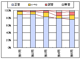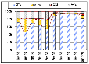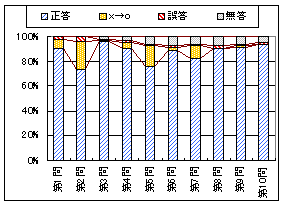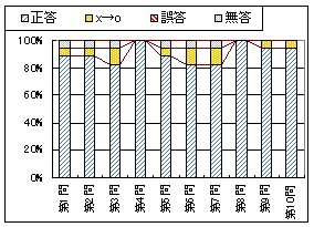 左のグラフ1は問題ごとの正答,誤答,無答の割合(正誤は最初の採点)で,黄色で示したものは初め誤答で再試行の結果正答に変った割合を表わす.