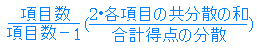 クロンバックのα係数![]() (=同じ値になる=) クーダー・リチャードソンの公式(KR20) (当サイトでの実際の運用) 「信頼性係数」は古典的テスト理論の重要な成果の一つであるとされているが,各項目間の整合性・一貫性は上記のI-T相関,I-R相関で調べることができ,ここでいう「信頼性係数」は再現性そのものを表わしているとは考えにくいので,当サイトではほとんど利用していない. 数百件のデータが複数回得られたときは,各項目間の正答率分布の一致についてχ2検定,同一項目の正答率の一致について分散分析で直接比較している.ただしこの場合は帰無仮説採択という消極的な結論しか得られないが,今のところもっとよい方法は思いつかない. |